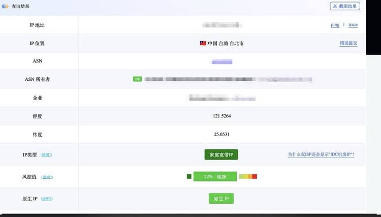 默认为台湾原生IP/台湾双ISP IP/台湾住宅IP(上游运营商根据查询为格洛宝通讯),多个数据库均显示为双ISP属性。有限制流量和不限流量两种,接入大带宽。