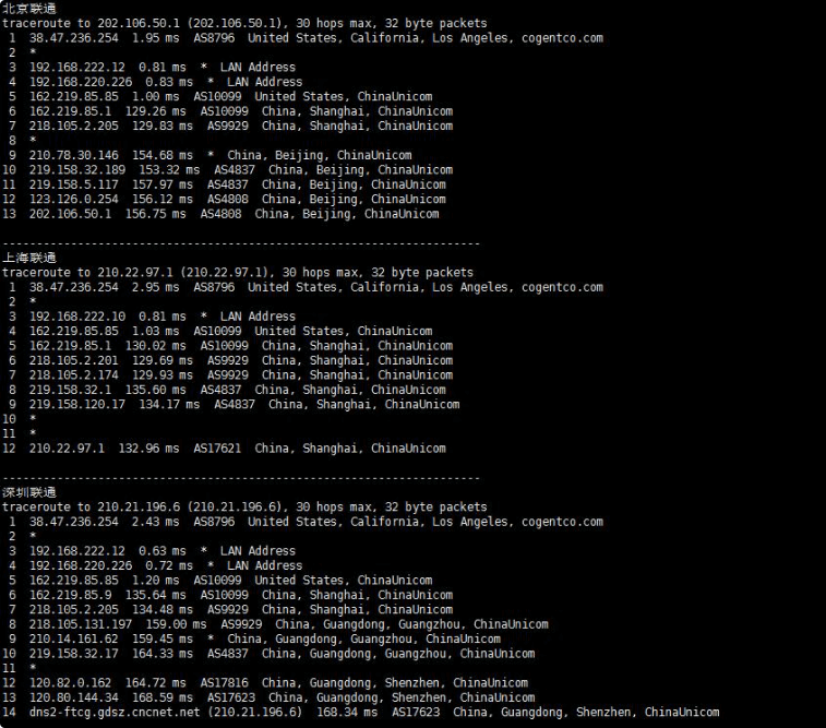 联通去程路由是从上海网口出去,然后直连洛杉矶机房,走的是AS9929的联通优化线路。